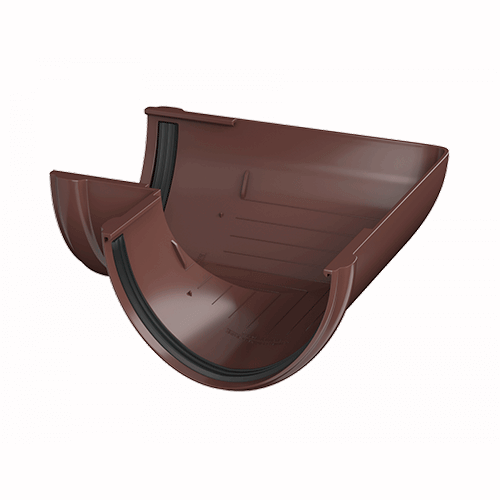 Угол желоба предназначен для соединения желобов на карнизах, которые лежат в одной плоскости, но расположены перпендикулярно относительно друг друга.